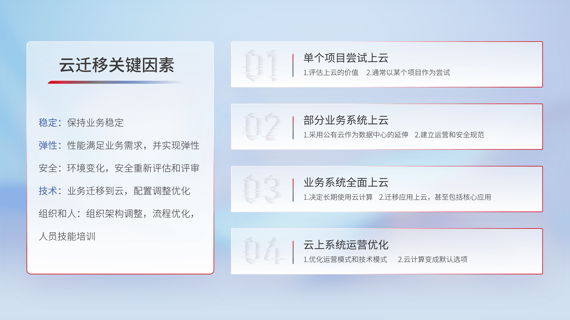 结合实际业务,,从规划设计、、、、云平台选型、、云原生改造、、、、数据迁移、、、集成交付,,,迁移全过程为客户识别最佳上云路径,,,,做好风险识别管理,,,,设计网络架构、、身份权限、、、安全审计合规、、、操作审计、、日志审计、、监控告警策略、、、、多站点容灾设计等,,,对云上基础设施进行整体规划,,提升IT治理水平,,以满足弹性、、、高可用、、、、高性能的需求。。。。
