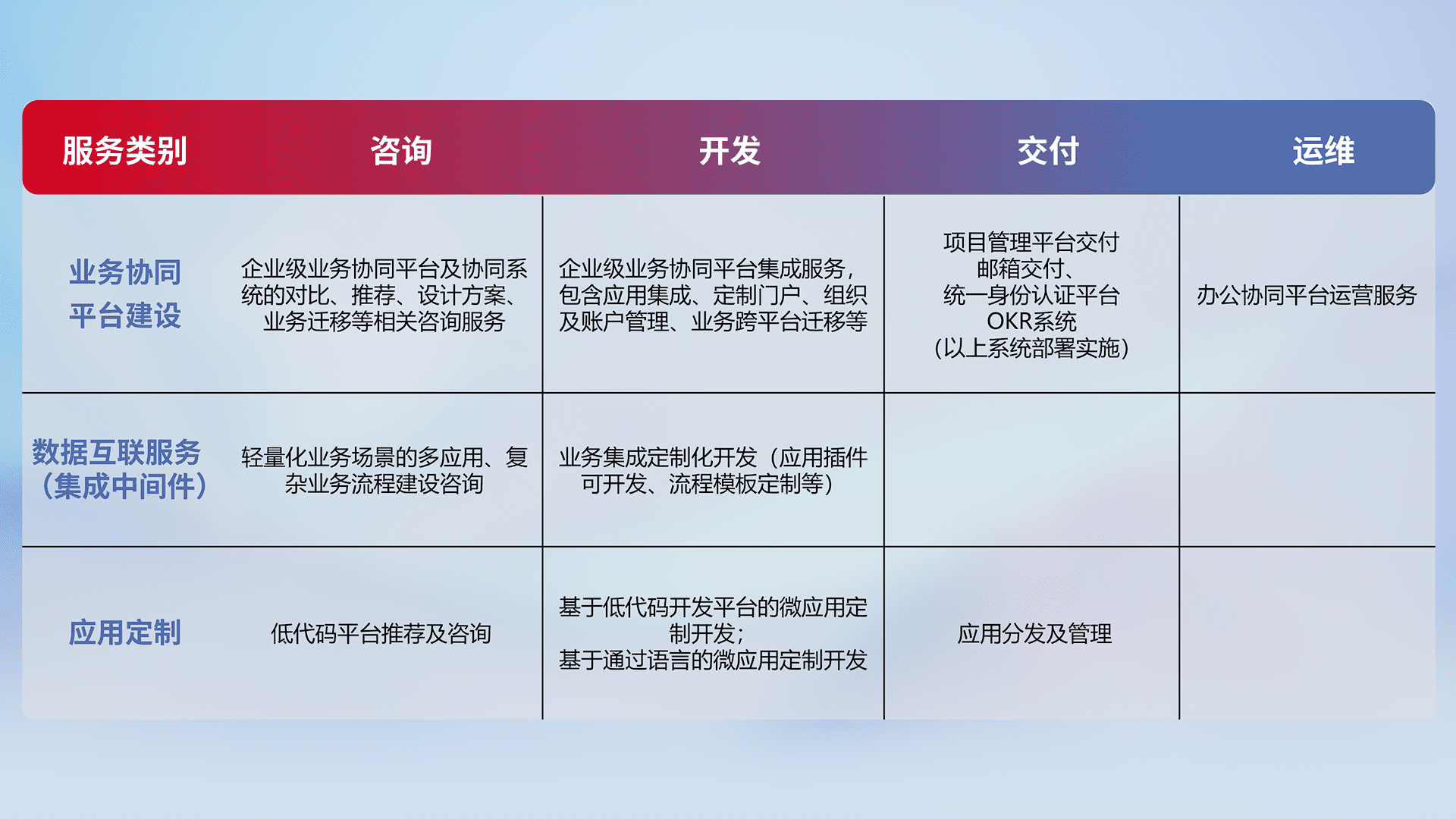 针对钉钉、、、企微、、、IDaas等平台级产品提供产品的规划、、方案、、、、交付、、、定制化开发等服务,,,实现如统一协同办公、、、、智能客户服务、、、、混合会议管理、、智能数据查询、、、等业务场景,,,,实现数字化转型。。。